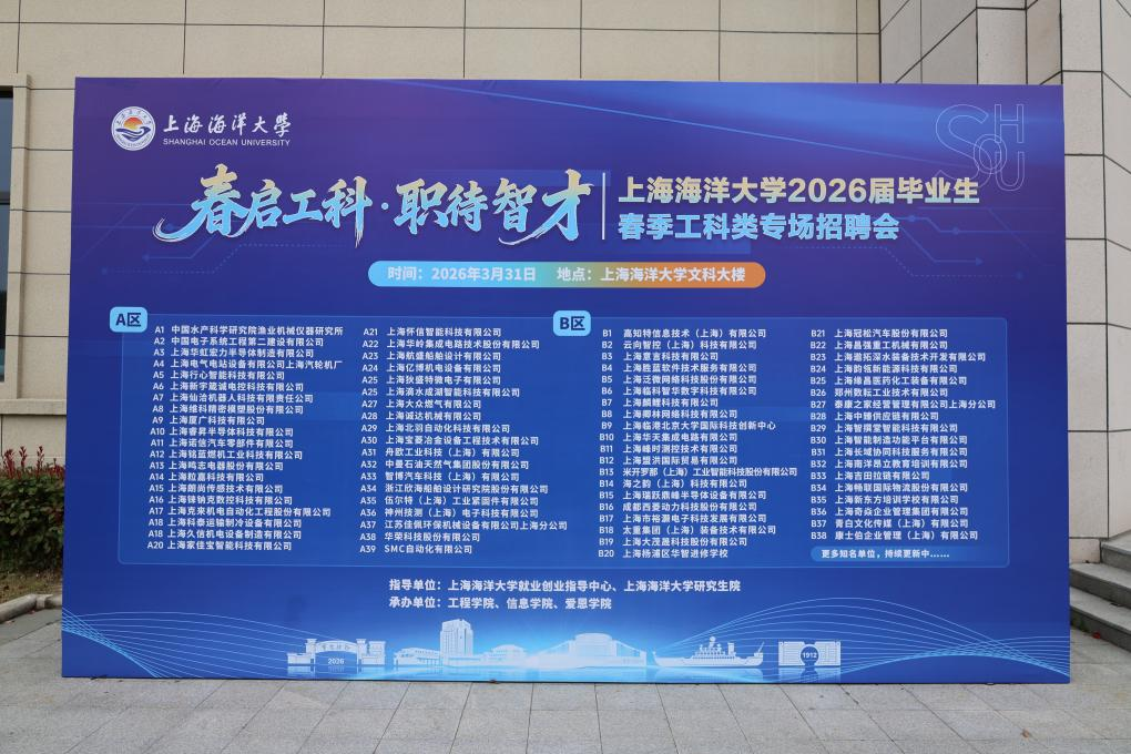 3月31日,上海海洋大学2026届毕业生春季工科类专场招聘会在文科大楼成功举办。本次招聘会以“春启工科·职待智才”为主题,由校就业创业指导中心、研究生院指导,工程学院、信息学院、爱恩学院联合承办。